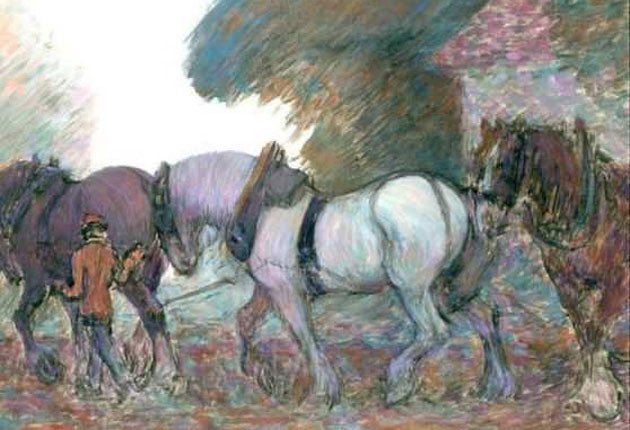 Bevan's best works here are of horses – ploughing; in cab yards; for sale at Tattersall's – and they date for the most part from 1911 to 1916. One, Under the Hammer (1913), shows him at his best. A gaggle of men are sizing up a frisky-looking horse. We see many of them from the back, in long, bright coats. The subject matter sounds dour, but Bevan transforms it. It's a beautifully balanced composition. Dead centre stands a small girl in a blue coat and hat, her pigtails secured by rich red ribbons. That detail, so right, makes the heart skip.