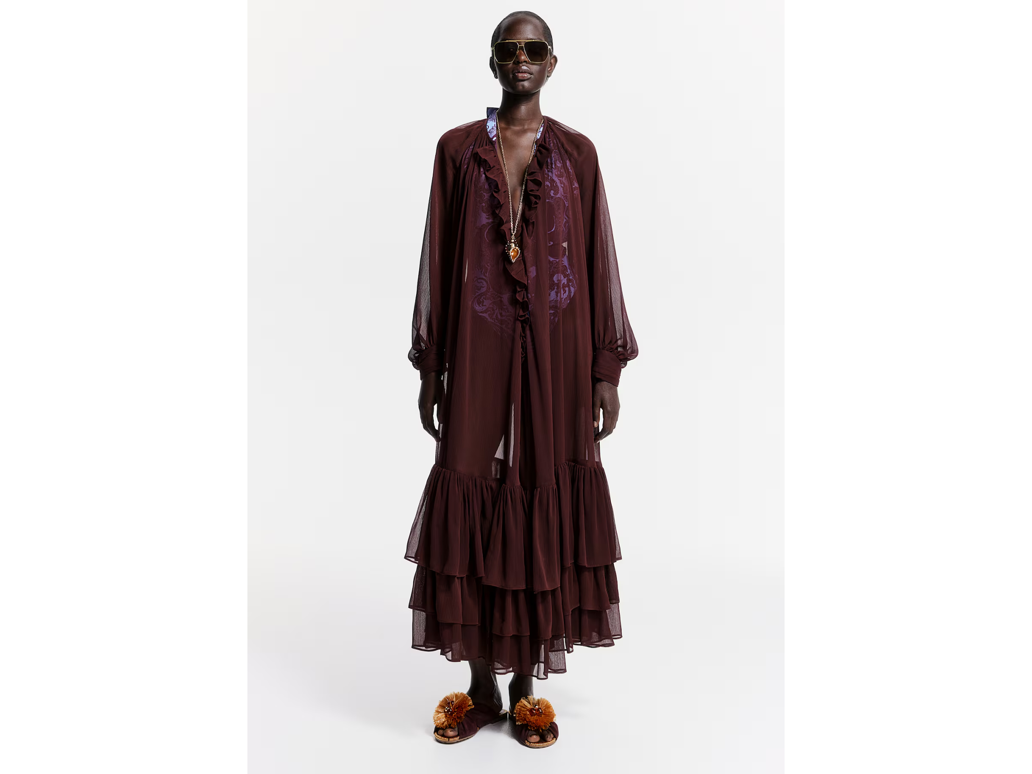 Perfect for throwing on over a bikini and looking instantly put-together while on holiday, this floaty chiffon dress belies its sub-£100 price tag. Characterised by Seventies-style ruffles and an open neck fastening, the cascading silhouette is elevated by the tiered maxi hem. Adding that final luxurious touch, the rich wine-red finish is sheer, letting your swimwear peak through.