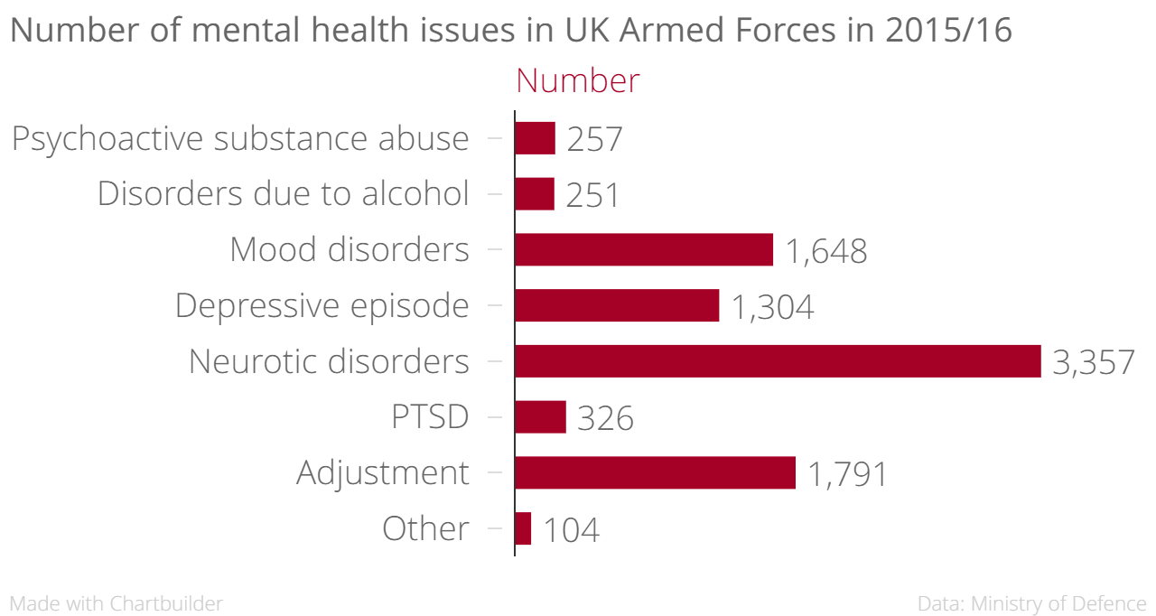 The Army has the highest rate of mental disorders at 10.8 per thousand, followed by the RAF (10.4), the Royal Navy (9.0) and the Royal Marines (4.9).