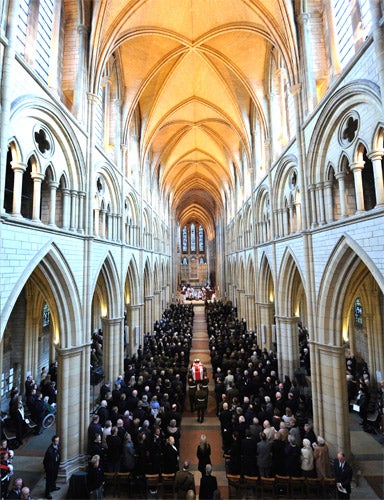 The centre of Truro in Cornwall came to standstill as the funeral cortège carrying Staff Sergeant Olaf Schmid, 30,travelled to the cathedral where he had been a chorister as a boy. As a lone piper played Amazing Grace, a coffin bearing the beret and commando dagger of which S/Sgt Schimd was so proud was carried into the church as his widow walked a few paces behind.