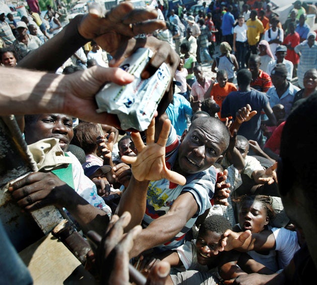 Meanwhile search-and-rescue efforts continue, but after almost a week under rubble the chances of people still being alive drop with every hour. On the site of the Caribe Supermarket, once Haiti's biggest, 60 people are thought to be stuck beneath the debris, surviving on bottled water from the store's shelves. Sixteen bodies and four survivors have so far been hauled out. A team of US rescue workers was attempting to retrieve the others yesterday, but by lunchtime had found nothing but corpses.