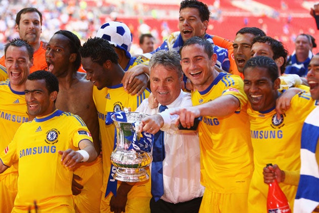 "We worked so hard since February and I respect these guys very much," Hiddink said. "This is the highlight, to win the FA Cup. When I was younger, there was one Saturday in May you had to find a television to watch the FA Cup. My only regret is not playing Manchester United a few days ago [in Rome]. So it was almost a perfect goodbye." The latest ever final, on the cusp of June, was played in fierce heat, which affected the tempo of the game after a lively opening spell, during which Chelsea fell behind to Louis Saha's goal; the quickest in Cup final history at 25 seconds.