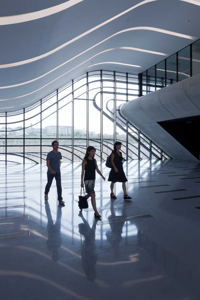 Amazingly, for a Hadid building, there is only one showpiece wow-moment: the approach to the main entrance, overhung by a the deep cantilever of its projecting auditorium, and a seriously big reception area with swerves upwards into the first floor's central hub space like a snow-boarders ramp. It was ideal for the female modern dance troupe at the opening, who performed in black bras to Ravel's "Bolero".