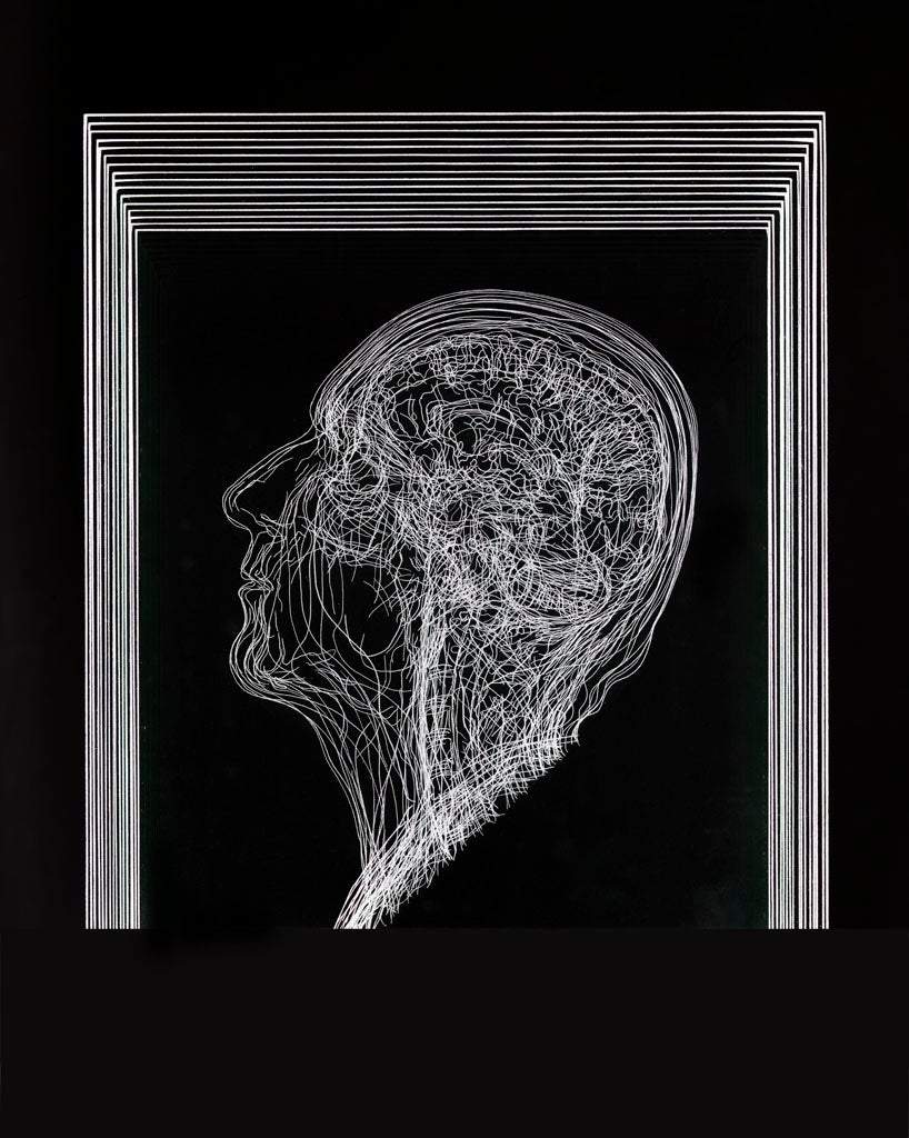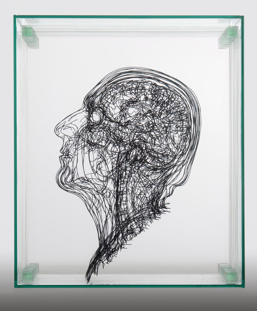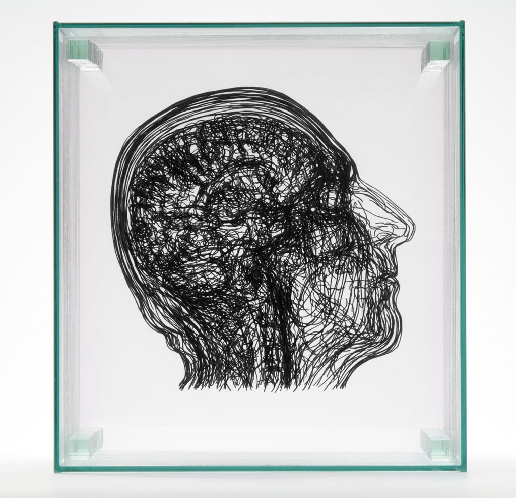 The artist Angela Palmer describes her work as “mapping”. She charts the geography of the human body using thin layers of glass, on which she paints detailed biological topography. Her source material is scans from MRI and CT machines normally used to detect disease in the body. The resultant effect is precise but not medical. Her work has been compared to an Ordinance Survey map of the human body. The overlaid marks are gestural and sketchy and could delineate a mountain range or undulating dessert.