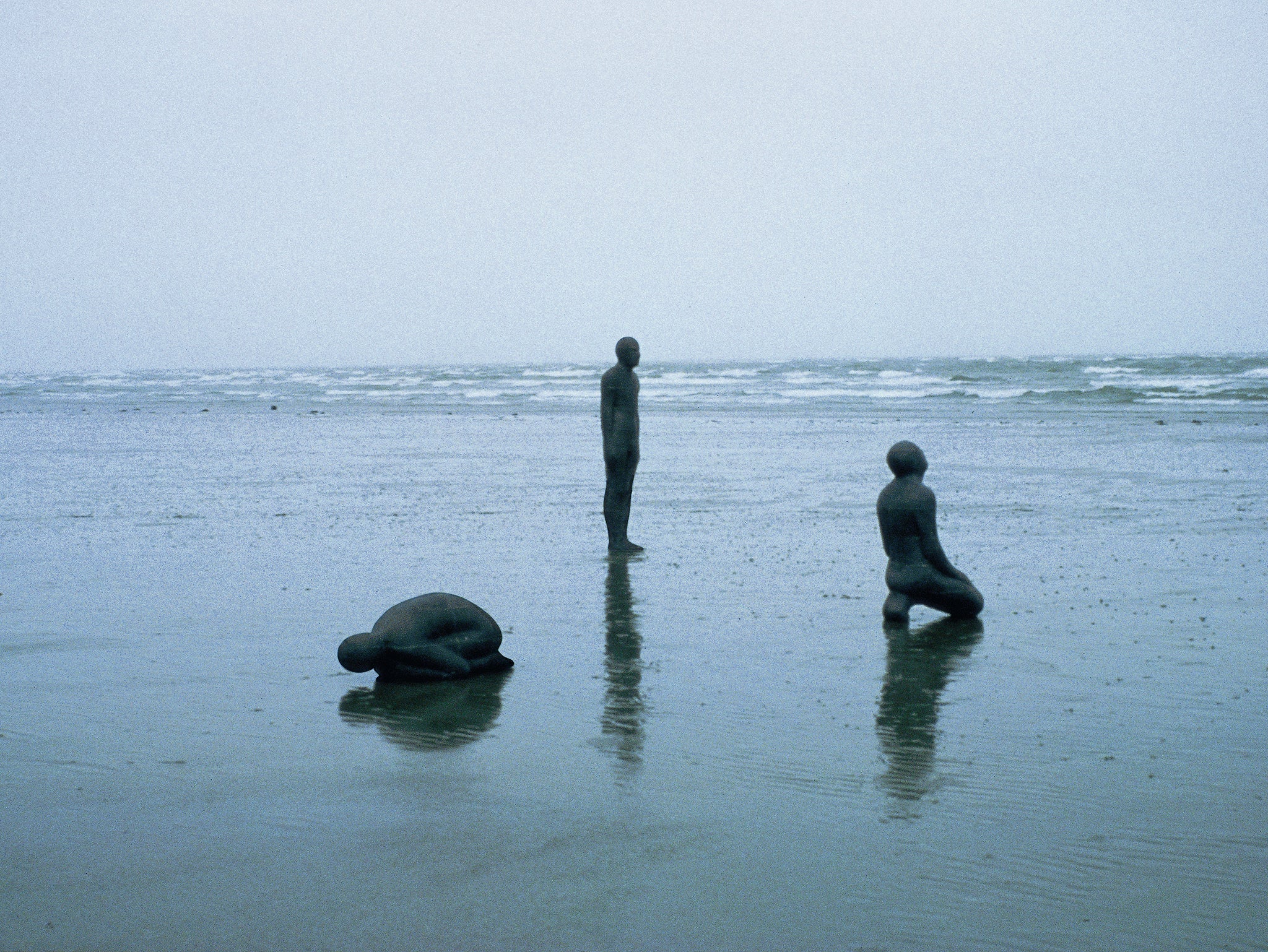 This three-piece work is Land, Sea and Air II (1982). It is an early attempt to try to make this memory of a real body connect, not to the white cube of a gallery or the context of an exhibition, but to the elemental world: to land, to sea, to air, and to link each of those elements with a physical posture and to link that physical posture to a perception. The work Land is a carapace pierced with holes at the ears, listening to the ground. Sea is the first work I made that opens the possibility of a sculpture as a body relating to the horizon. It has its eyes open, looking out to sea. Air is an empty plaster mould covered with lead, a body case with nostrils open. Lead is a wonderful insulator – against liquid or sound leakage, against radioactivity. […] These two ideas – not taking the skin of things as a limit, and the power of immersing a culturally made object in the elements – I have put to work again and again.