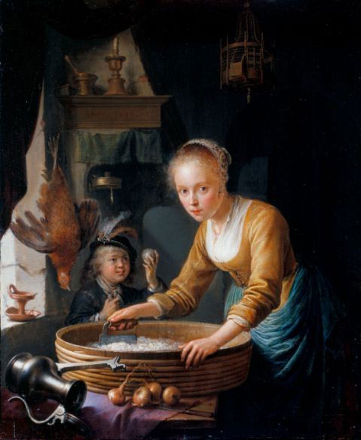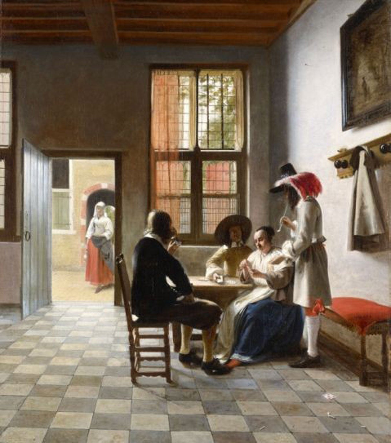 It is the genre of interior scenes that most beguile, however. Vermeer is notable by his absence. The Queen’s A Lady at the Virginal with a Gentleman is being loaned to the National Gallery for its exhibition of Vermeer and Music at the end of the month. But even without it, the Holburne exhibition can boast a handful of the best of the genre. Gerrit Dou is justly used on the poster with a detail of his minutely pictured A Girl Chopping Onions, filled with the symbols and mood of carnal promise. Pieter de Hooch’s Cardplayers in a Sunlit Room is a hyper-realist study in light way before its time.
