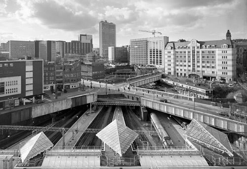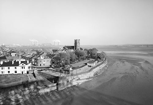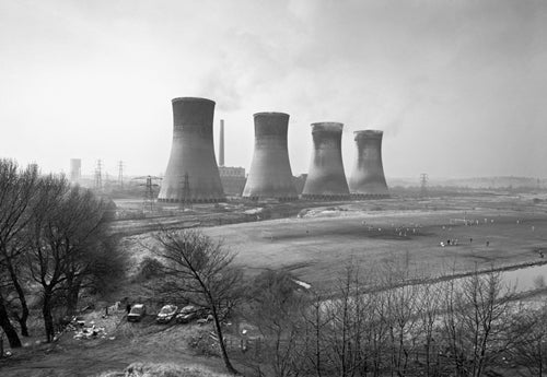 John Davies has been working on The British Landscape series since about 1979. Images include the panoramic view of Stockport Viaduct, England, 1986, while Agecroft Power Station, Salford, 1983 shows people playing football in front of an industrial wasteland. Victoria Promenade, Widnes, 1986 shows a church set against steam from distant power stations.