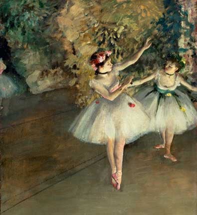 Even the Impressionists, juddering back and forth before their canvases (and obliging viewers to do likewise), were no more obsessed with movement than Degas. A pastel dancer raises herself en pointe, presumably for sheer love of her craft (Two Dancers in the Foyer); an oil ballerina dips her head at a carefully prescribed angle before an audience (Two Dancers on the Stage). Both paintings celebrate motion: dance itself, but also the complicated pattern of steps between public and private.