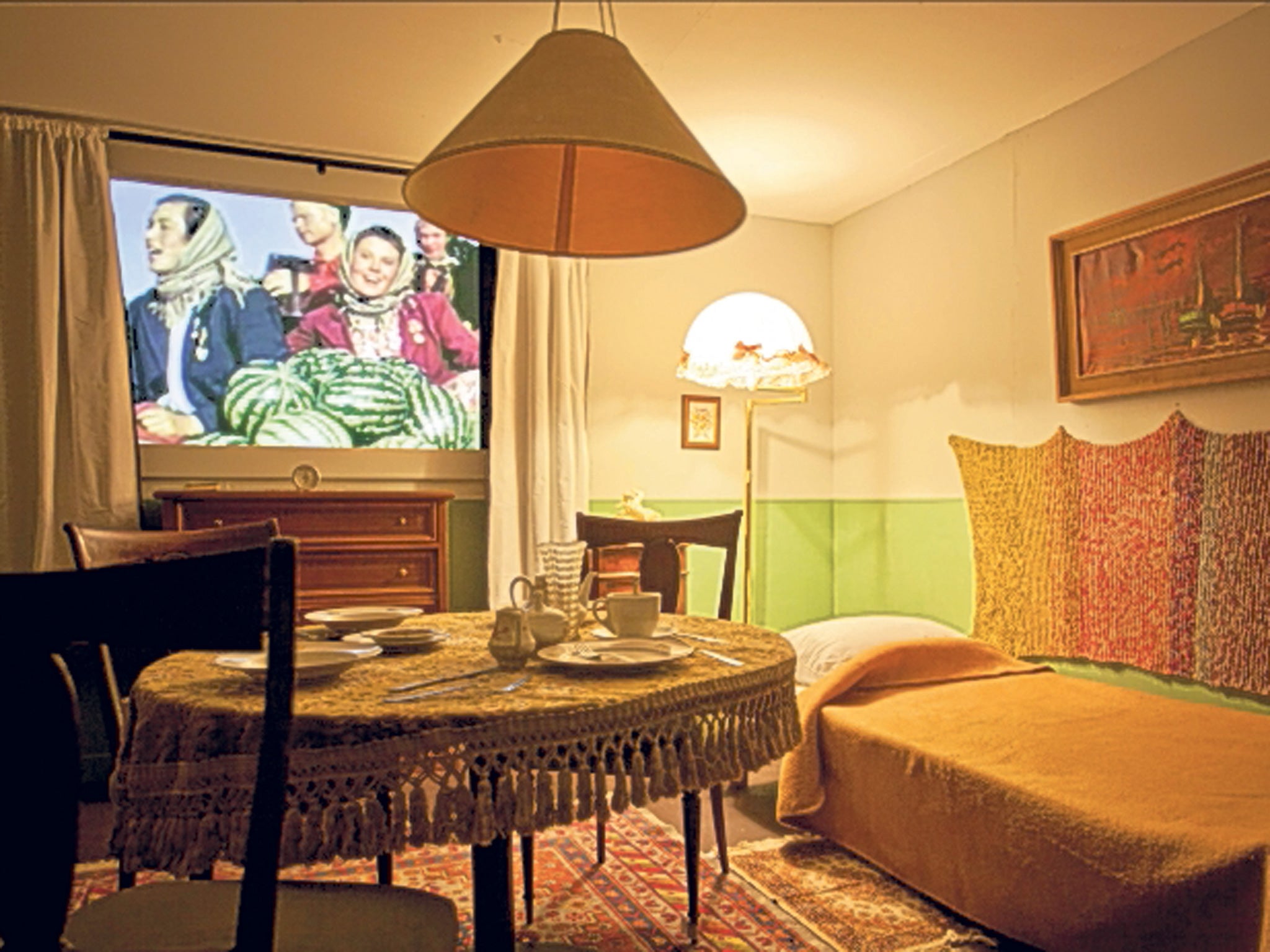 The legacy of Soviet Russia is discernible in their work. Even The Happiest Man has a double-edged significance. While the screen of utopian images of happy people in green fields taps into a universal human desire for escapism through film and cinema, the footage the Kabakovs used is Soviet propaganda.
