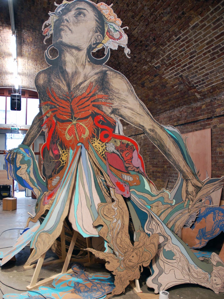 "There's definitely a perception of street art as being kind of macho," admits Swoon, aka Callie Curry, speaking from her installation at the Black Rat Projects. "You do have to be a little macho to do it. But we all have to be a little macho sometimes." Swoon is certainly not against getting her hands dirty for her art: in 2006 she used scavenged materials to make a giant raft that would float down the Mississippi River, and in 2010 built sustainable, creatively designed homes for the victims of the earthquake in Haiti.