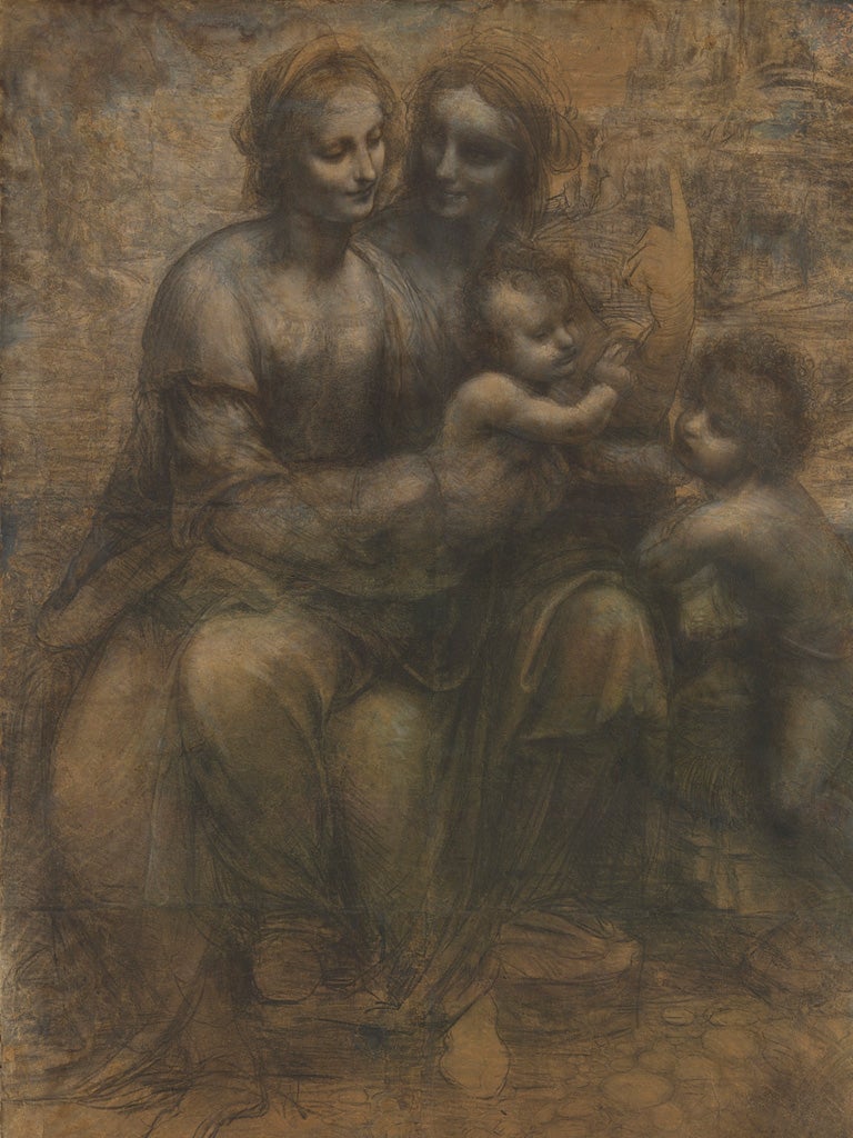 Looking at the cartoon, I warmed to Leonardo's free, immediate handling of charcoal heightened with white chalk. While giving the group of four figures a sculptural power, he emphasised at the same time the spontaneous human affection between them – above all where the Christ Child leans across to bless the infant Baptist and touch him playfully under the chin. St Anne, the Virgin's mother, smiles at her daughter with an intense devotion, and points up to heaven. But Leonardo reduces the whole of her hand to a minimal outline. Its emptiness makes us aware of just how ghostly the other figures are as well.
