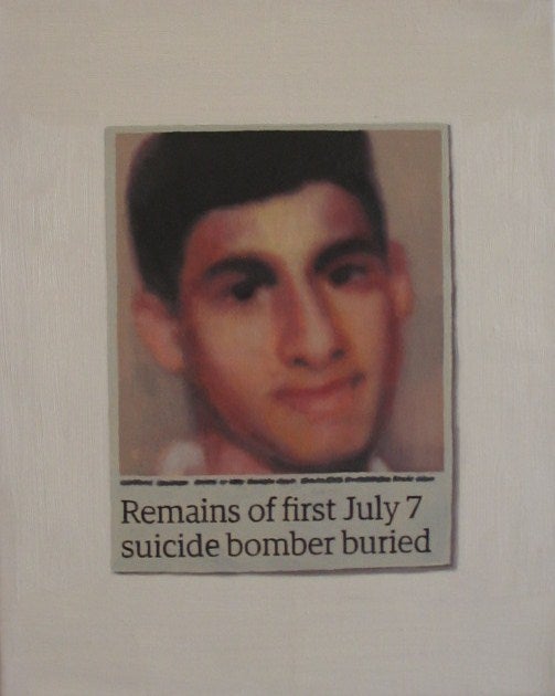 Using images (such as the front page of The Independent, pictured) which a chunk of the public will have come into contact with in newspapers but quite possibly given little attention to – perhaps throwing them away after a glance or flipping over them to a more interesting page - and cementing those images in the permanency of oil paint is a clever technique. As Mendes remarks (above), the public sometimes responds to the neat packaging of what goes into the newspapers in a sanitised manner. Presenting that same snapshot in a totally different setting, such as an art gallery, may well provoke a different reaction.