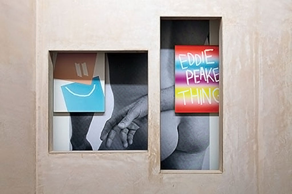 Hanging in higgledy-piggledy fashion are small, vibrant paintings daubed with slogans couched in the slang of north London, where Peake hails from. Later these will be added to the striking black-and-white poster images the artist has become notorious for. Things are tacked up ruthlessly with drawing pins, as if they were worthless notations. A knowing casualness and sexuality infuse the space.