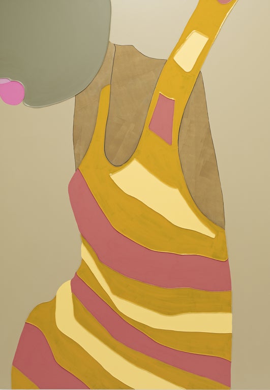 There’s a sexual element to some of Hume’s paintings, too, which is somewhat confusing and often never reveals itself absolutely. A painting called Horizon is a mass of peachy skintone gloss. Lines cleave through the painting, centring on a dark, dusky pink shape that looks like a vulva. At the centre of this shape is a small section of aluminium that has been left bare of any paint, so it looks like a hole. It’s difficult to work out however, how all of the lines and shapes would fit together to be a part of a woman at all.