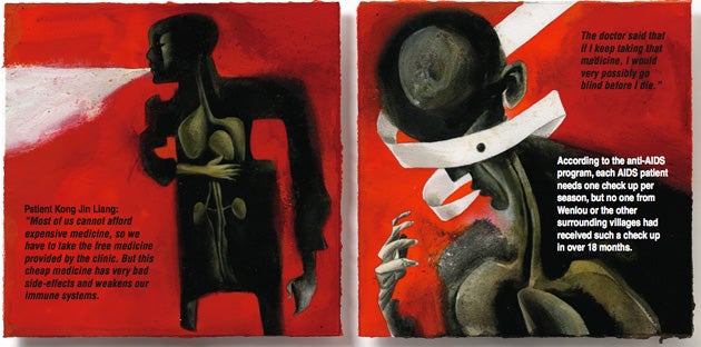 As well as excerpts from the book on display, which are simply clipped on to bare walls, there are older comics in glass cabinets, including some from the personal collection of Paul Gravett, the founder of the festival. There's Dave McKean's adaptation of a story on the corrupt pharmaceuticals industry in China, written by an anonymous Chinese comic artist; a strip on the recent elections in Iran from "the godfather of comics", Pat Mills, who's known for his stories on often controversial subjects and Dylan Horrocks's strip on an ideal, uncorrupt world.
