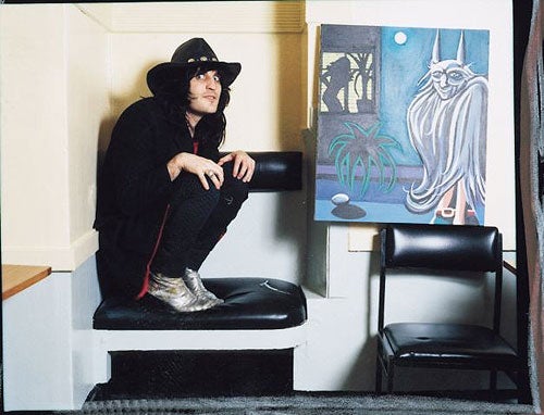In an effort to find out, I meet Fielding at a patisserie in Soho. He's not hard to spot. Like a technicolour version of his friend Russell Brand, he has a permanent grin, Mr Punch profile, and the shaggy hair and dress sense of the New York Dolls: this afternoon he's wearing a floppy black cowboy hat, long black coat, red Mighty Boosh T-shirt, tight polka-dot trousers and silver shoes. While Barratt is a publicity-shy family man, Fielding is an extrovert tabloid fixture who immediately starts talking about his mate Johnny Borrell from Razorlight, and about how Frank Zappa's daughter knitted him "this really long amazing cape". You don't interview him as much as dip a bucket into his burbling stream of consciousness. The only way he can relax, he says, is by painting.