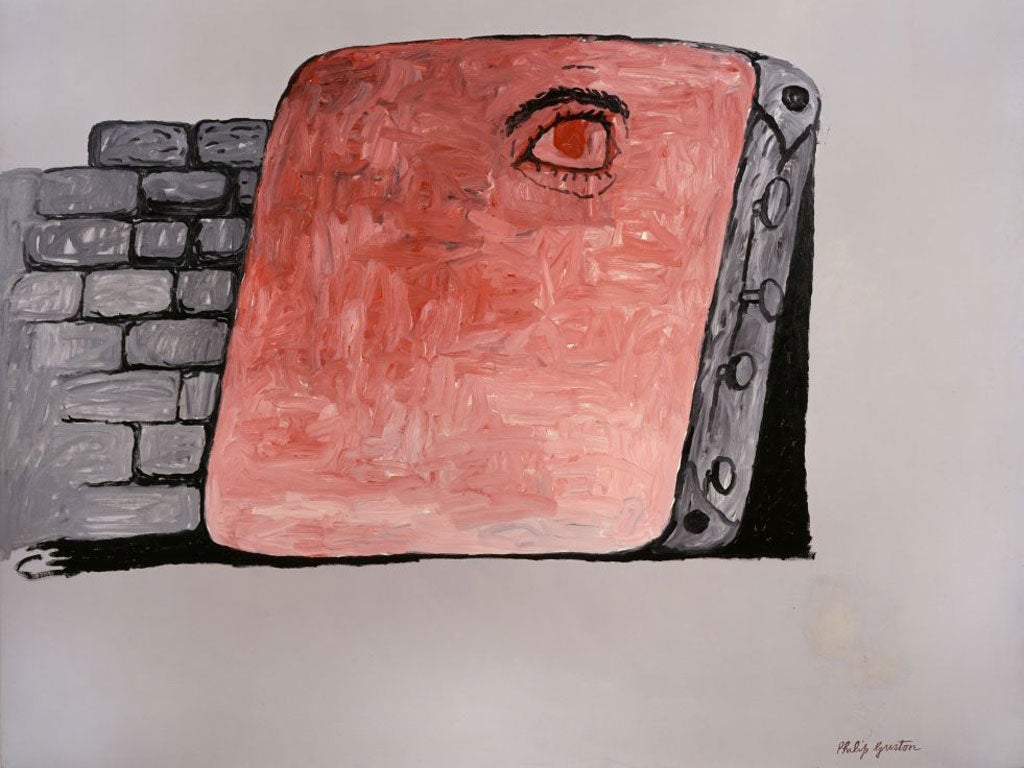 What makes them so compulsive? Even today you can see why his contemporaries and supporters were so appalled by Guston's new turn. The characters are childlike. The imagery of Ku Klux Klan hoods, cigars and cyclopic eyes is crude. The palette is limited to the colours of flesh and earth, pink, ochre and greys. The brushwork is broad to the point of slapdash. And yet you are drawn in to the conversation of an artist talking to himself and then looking up at you with an ironic and despairing grin.