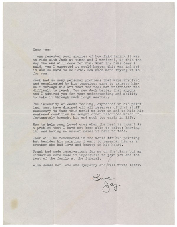 Jack had so many personal problems that were involved and complicated by his tenacious urge to express himself through his art that the real man underneath was difficult to reach. You new [sic] Jack better than anyone and I admired you for your understanding and ability to take it through much rough weather.