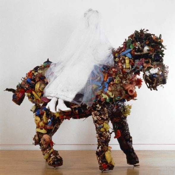 From her earliest works, she had understood the power of very densely encrusted collage (an odd point she has in common with her near contemporary Peter Blake). In reliefs and sculptures from the Sixties, like Miss Havisham's Dream or The Bride on Horseback, you find encrustation given a double role, as a mixture of plague and adornment. Large-scale figures are covered in bee-swarms of plastic toys and knick-knacks – soldiers, guns, dolls and doll-babies, skulls, various kinds of animal and critter. These things feel like a bugging infestation of social/psychological stuff, but also like evils that the goddess can simply wear as attributes, body-jewellery, incorporate into herself, ride through. They are all little; she is big.