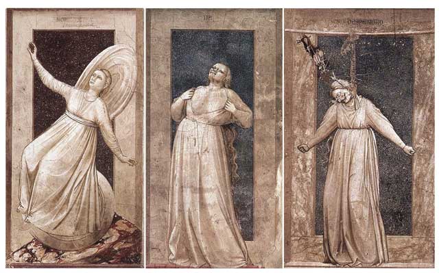 The Virtues are standard. There are three theological Virtues, Hope, Faith and Charity, and four classical Virtues, Justice, Wisdom, Fortitude and Temperance. But the Vices are not the now-familiar Seven Deadly Sins. Giotto's cast is more closely paired with the seven Virtues. He pictures Despair, Infidelity, Envy, Injustice, Folly, Inconstancy and Anger. Three are shown here: Inconstancy, Anger, Despair.
