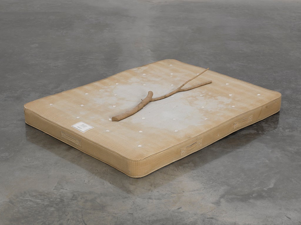 “Dead Sea” consists of a lonely sculpture of a bronze branch laid on top of a “ready-made” stained mattress. The work echoes Emin’s famous 1998 work, “My Bed”, which featured the artist’s bed complete with dirty sheets, used condoms and overflowing ashtrays.