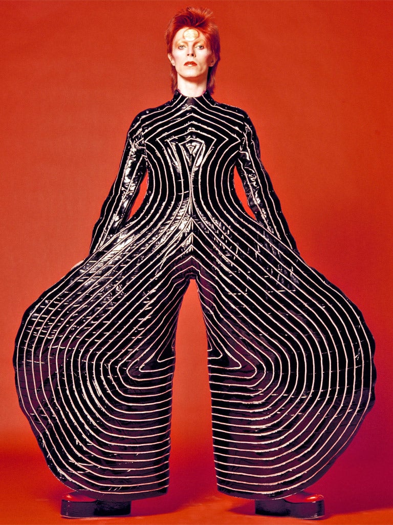 The Ziggy Stardust outfit, designed by Bowie with Freddie Burretti, took inspiration from the “droogs” street gang in Stanley Kubrick’s 1971 adaptation of A Clockwork Orange.