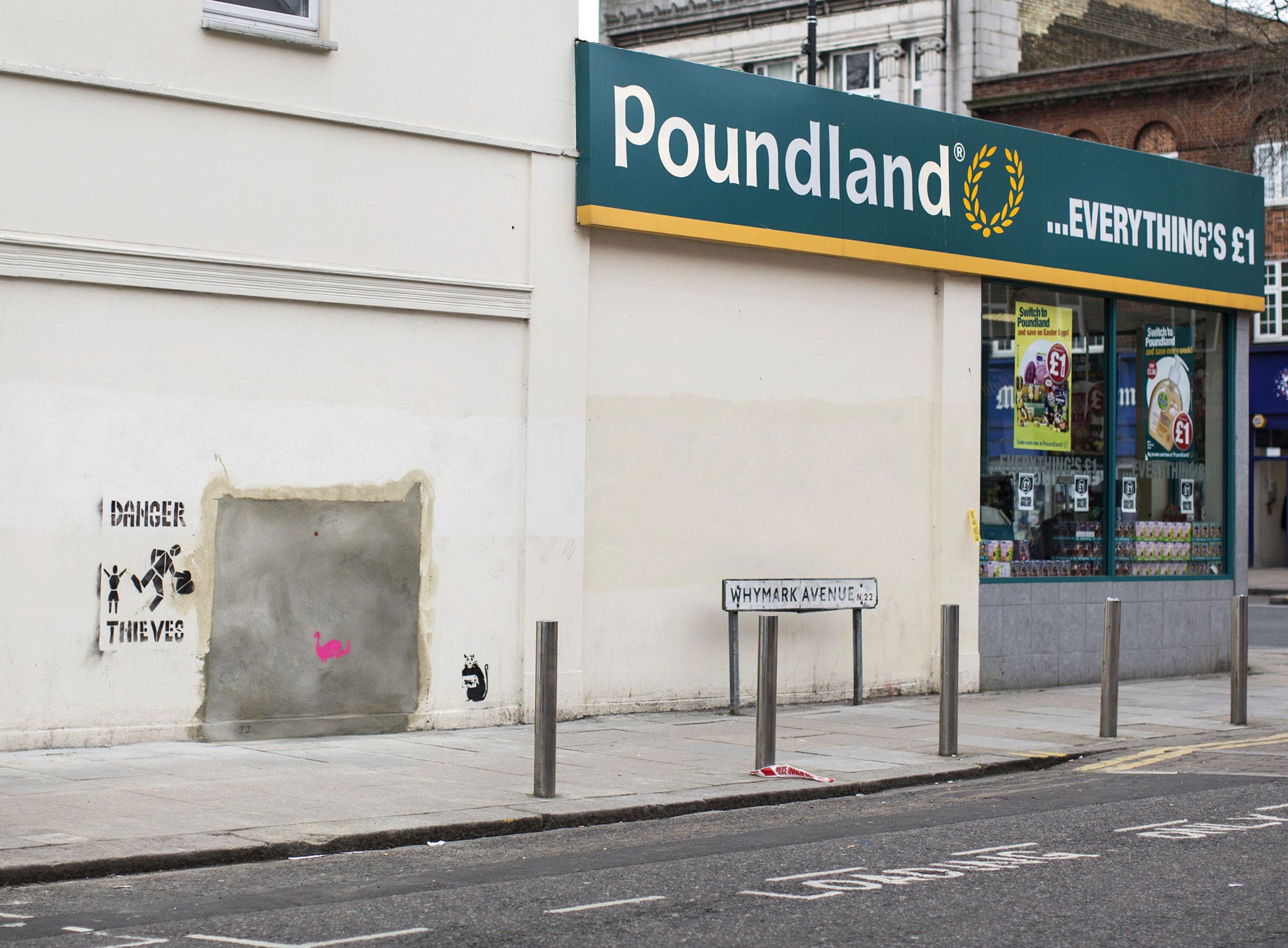 But yesterday the Banksy was cut out of the wall near Tottenham High Road at the junction with Philip Lane.