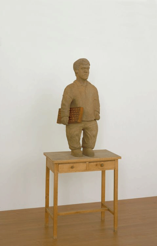 This is Juan Muñoz's Dwarf with a Box, quite an early work, but like others of his figures it has an elusive presence. It feels a bit like one of us. It's not a marble figure on a marble plinth. It's part of our world. It stands on a real table, holds a real box, shares our space and our light. At the same time, these real-life props only emphasise that this is not a real man. It is a thing of baked clay, an inert and passive object, stood on its table like a big ornament, something that could be picked up or knocked over. And the blank look, the turned back, reiterate this withdrawn muteness.