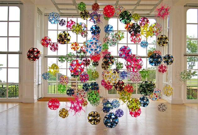 Start at the top, on the fourth floor, in the gallery which overlooks the town centre, and which gives you a pleasing, bird's-eye view of small-scale industrial dereliction and small-scale renewal, all set against the meandering canal network of the Black Country. The huge piece which dominates the gallery up here, and sets the tone for the entire show, is David Batchelor's Disco Mécanique, a strange, mechanised, nostalgia-soaked whirligig of plastic balls made from pairs of sunglasses, suspended and turning in the air. This piece was last seen at the Folkestone Triennial, where it dominated the ballroom of a grand, sea-front hotel. The mood is mesmerising and slightly sad, a reflection upon long-gone partying perhaps.
