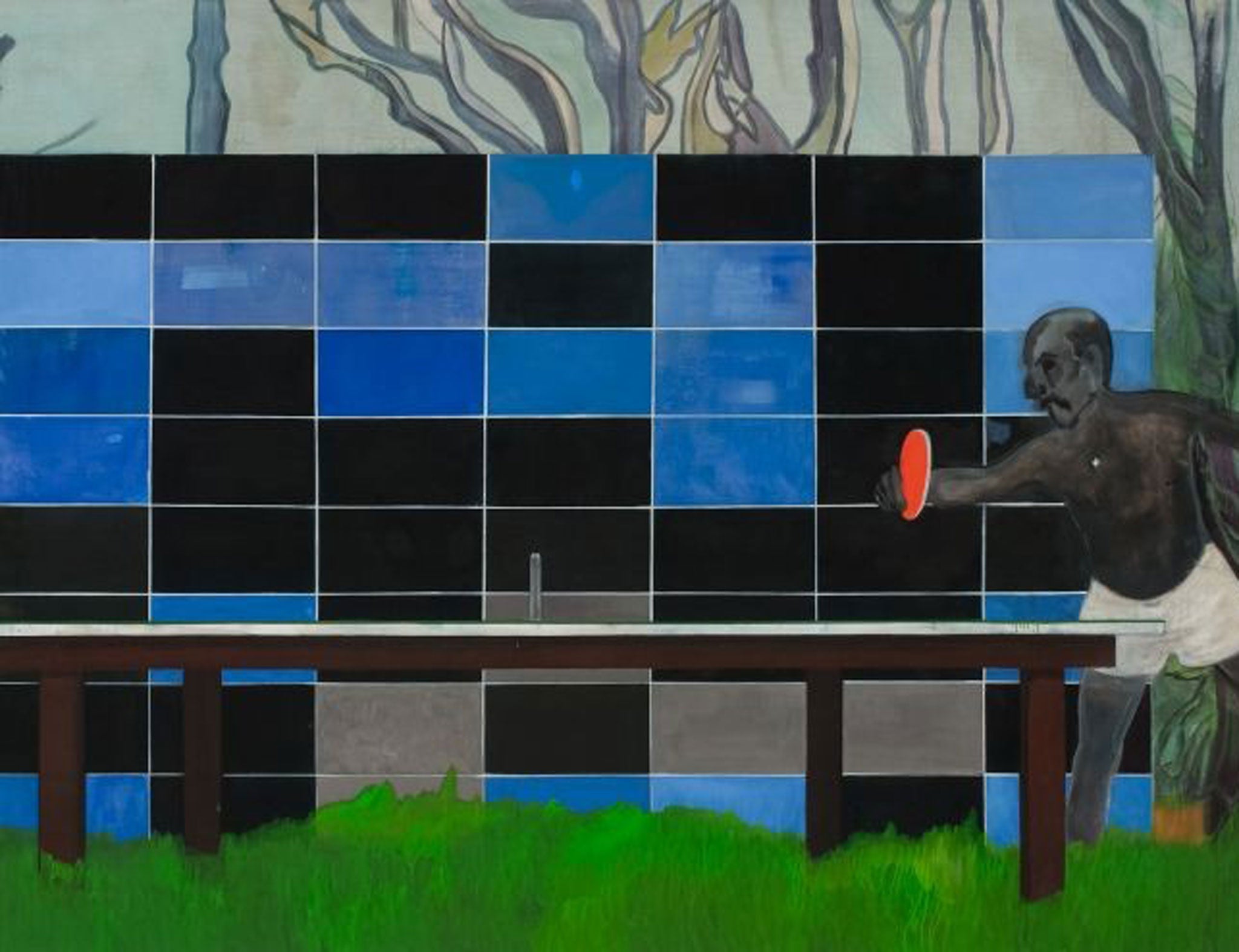 Sport comes into play, as it did with skiing and skating in the Canadian pictures. There’s a striking Gauginesque picture of cricketing, Paragon from 2006, in which the energy of the bowler is played against the tension of the waiting batsman and the ease of the fielder across red sands and swirling water, and a classic Doig painting Ping Pong of 2006-08, in which the thrusting player is moved to the side and the centre taken up by a geometric stack of blue and black squares based on a pile of bright beer crates which the artist had photographed.