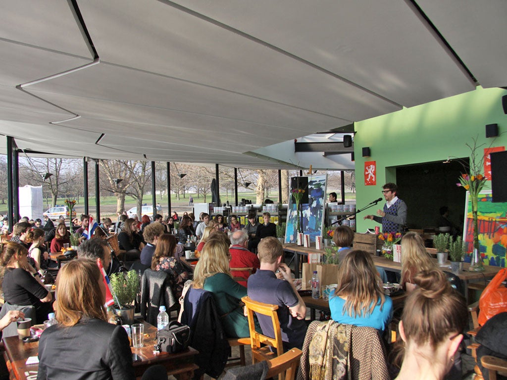The event coincided with the translated Lekker Dutch issue, the first in a series of planned world issues of Litro Magazine. The programme began at the Serpentine Bar and Kitchen in Hyde Park before moving to the Kensington Gore Hotel in the evening.