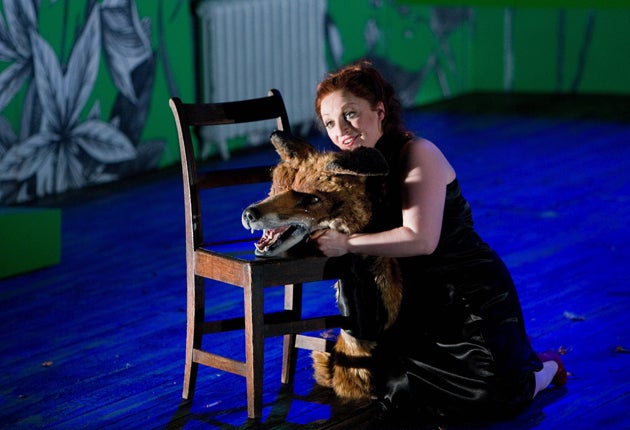 Stuffed with cotton and plaster and mounted on the wall of a dusty room, the stag, badger, fox, boar, hare, rabbit and pheasant that watch glass-eyed over David Alden's production of The Cunning Little Vixen are a warning.