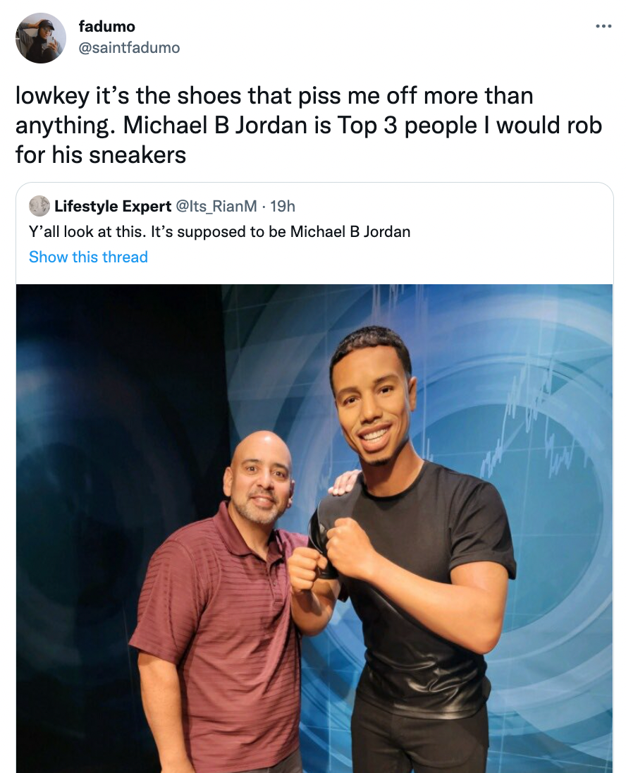 Michael B Jordan’s wax figure has fans in hysterics.