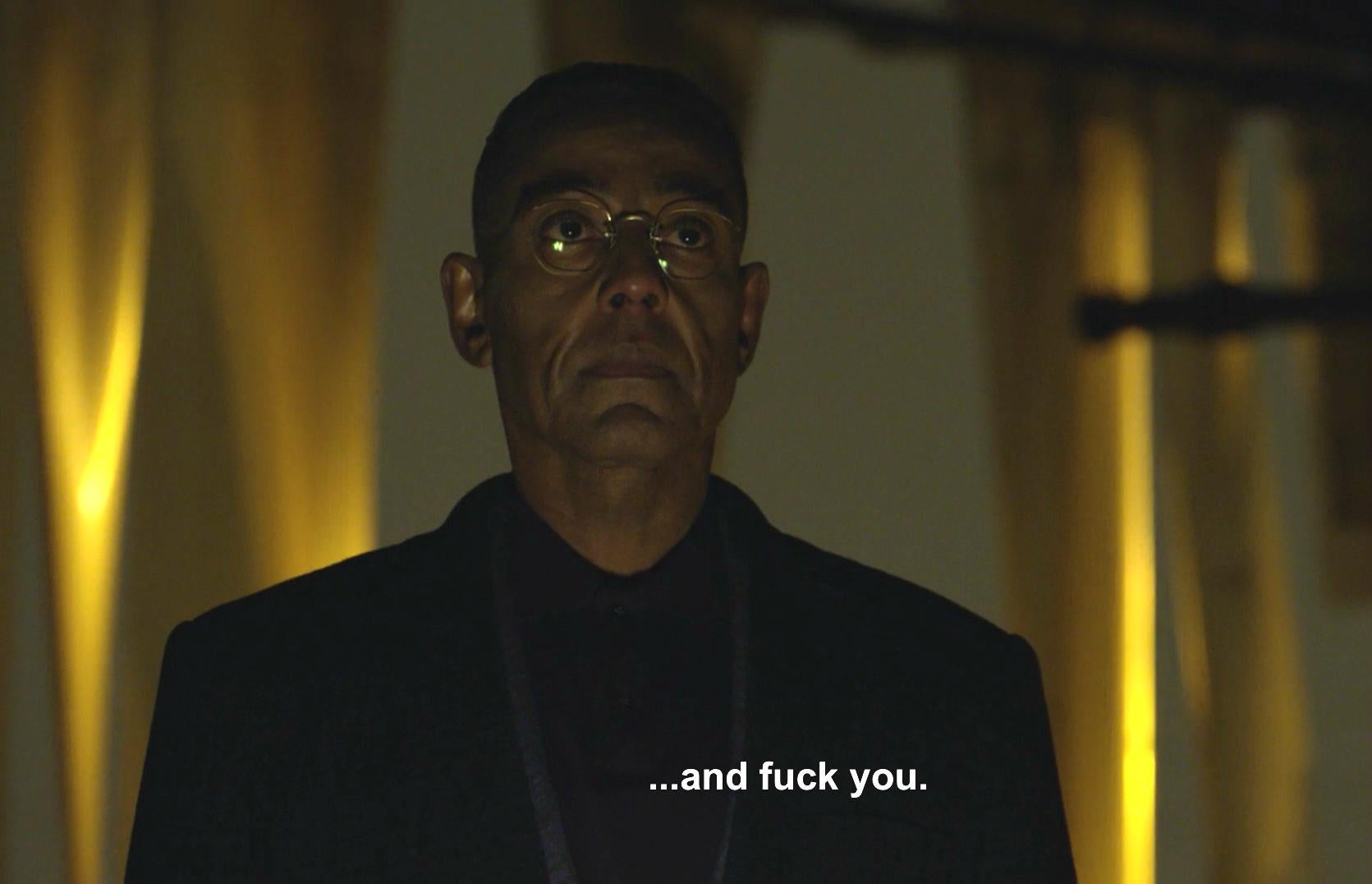Hector was not best pleased, saying a terse “fuck you” to Eladio behind his back and Gus to his face.