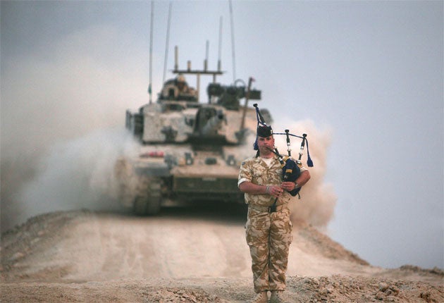 The recording itself was stifling. We had to turn off the air conditioning for each take and the studio (the officer's mess tent) quickly became an oven. Playing the bagpipes is surprisingly physical, and one of them suffered heatstroke after the recording. The others went straight back out on to patrol. Angus Benson-Blair, who made such a moving speech last night, came in from a Basra town centre "teeth armed", put down his rifle, led the singing and immediately went back out on active duty. The most moving moment was Pipe Major Ross Munro's rendition of "Flowers of the Forest" in full ceremonial kit on the runway. He was suffering enormously but kept playing until we had our take.