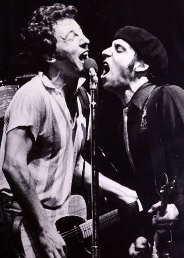 For a long time, however, Bruce Springsteen would not have turned any heads as he exited a strip club. An ineffectual high-school student sustained by dreams of rock'*'roll stardom, he spent his teenage years performing in local New Jersey bands like The Castiles, Steel Mill, Sundance Blues Band and Dr Zoom & The Sonic Boom, groups whose names indicate the diverse range of musics with which he developed a familiarity: R&B, rock'*'roll, heavy metal, blues, soul, and whatever psychedelic delights were indulged by Dr Zoom. By the time he was 23, he had assembled around him the musicians who would form the core of The E Street Band, and had developed the facility at writing verbose, Dylanesque songs that originally attracted the attention of John Hammond, the legendary talent scout who had discovered Billie Holiday, Charlie Christian, Bob Dylan, Aretha Franklin and Leonard Cohen.