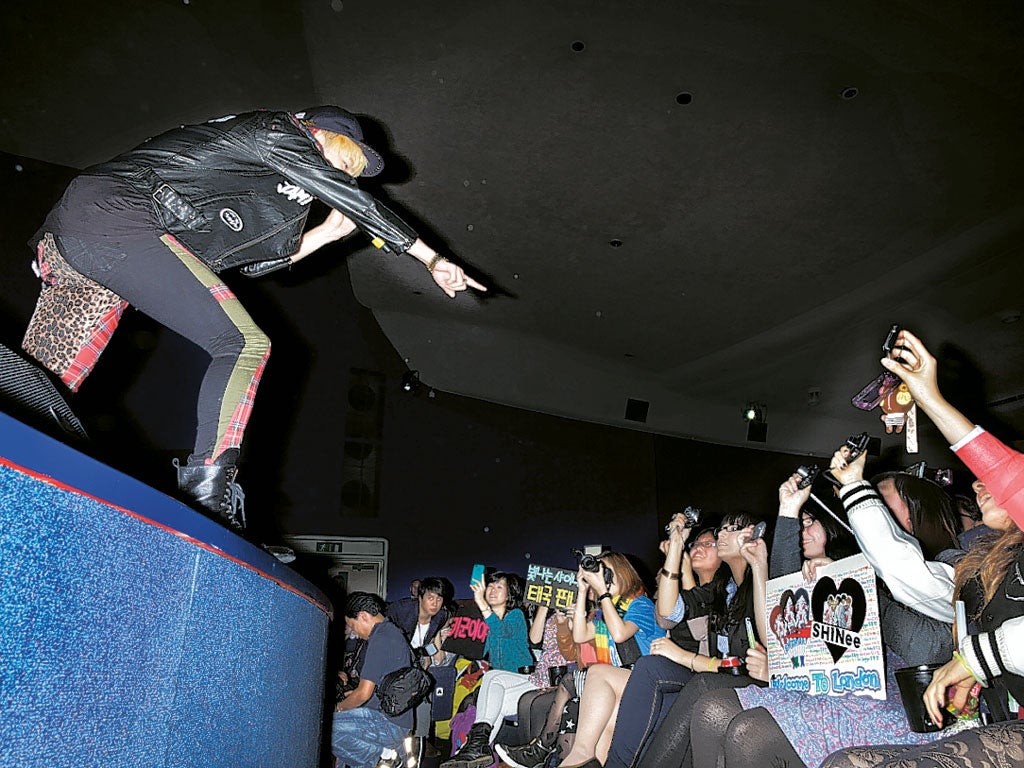Sarah Yates, a 20-year-old from London, is watching with her Korean classmates: she signed up for free language classes at the Korean Cultural Centre in the capital after getting into K-pop, and now a gang of them run their own blog as the 'Korean Class Massive'. Her classmate Tamana Sudika attempts to explain SHINee's particular appeal, though she seems to be about to bubble over with excitement: "SHINee are amazing – one word, amazing! Their dancing... their songs... everything is amazing about them."