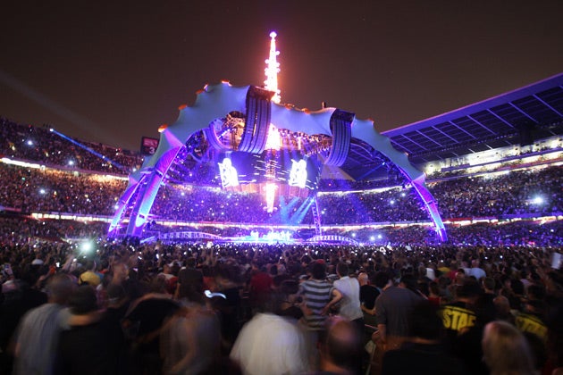 The extraordinary steel structure is 50 metres high and takes crew members four days to assemble. There are three versions of the colossal, spaceship-like structure, designed by Willie Williams and the architect Mark Fisher, so that while this one was in use at U2's 360° tour opener at Barcelona's Camp Nou stadium on Tuesday, another was under construction at a different venue. And that screen has half a million pixels, too.