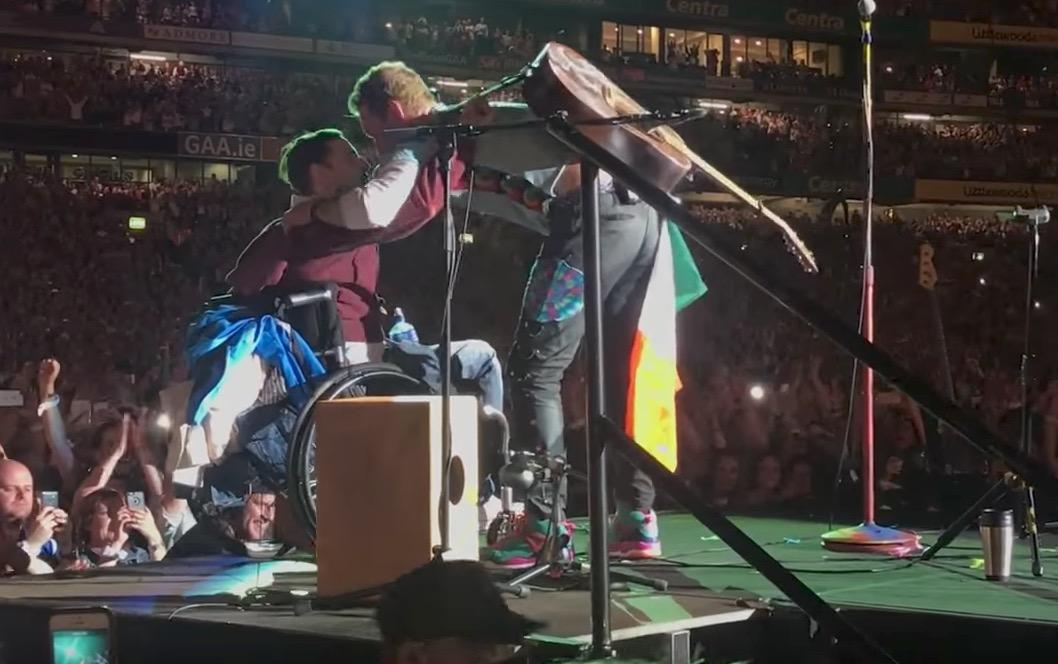 A Coldplay fan in a wheelchair managed to crowd surf to the front so the band invited him on stage
