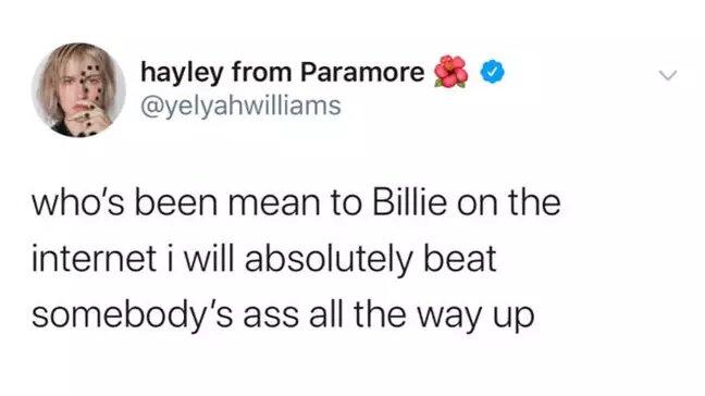 In a now-deleted Tweet, Williams wrote: “Who’s been mean to Billie on the internet i will absolutely beat somebody’s ass all the way up [sic].”