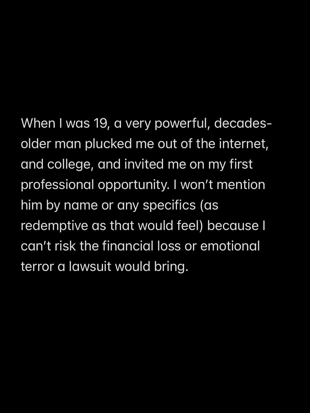 After taking her under his wing, Canal alleged that the older artist began touching her and taking photos without her consent. “This person verbally admitted to me (while I was in an extremely vulnerable position) that getting me in this position had been his plan all along — from the moment he saw my face on the internet,” she wrote.