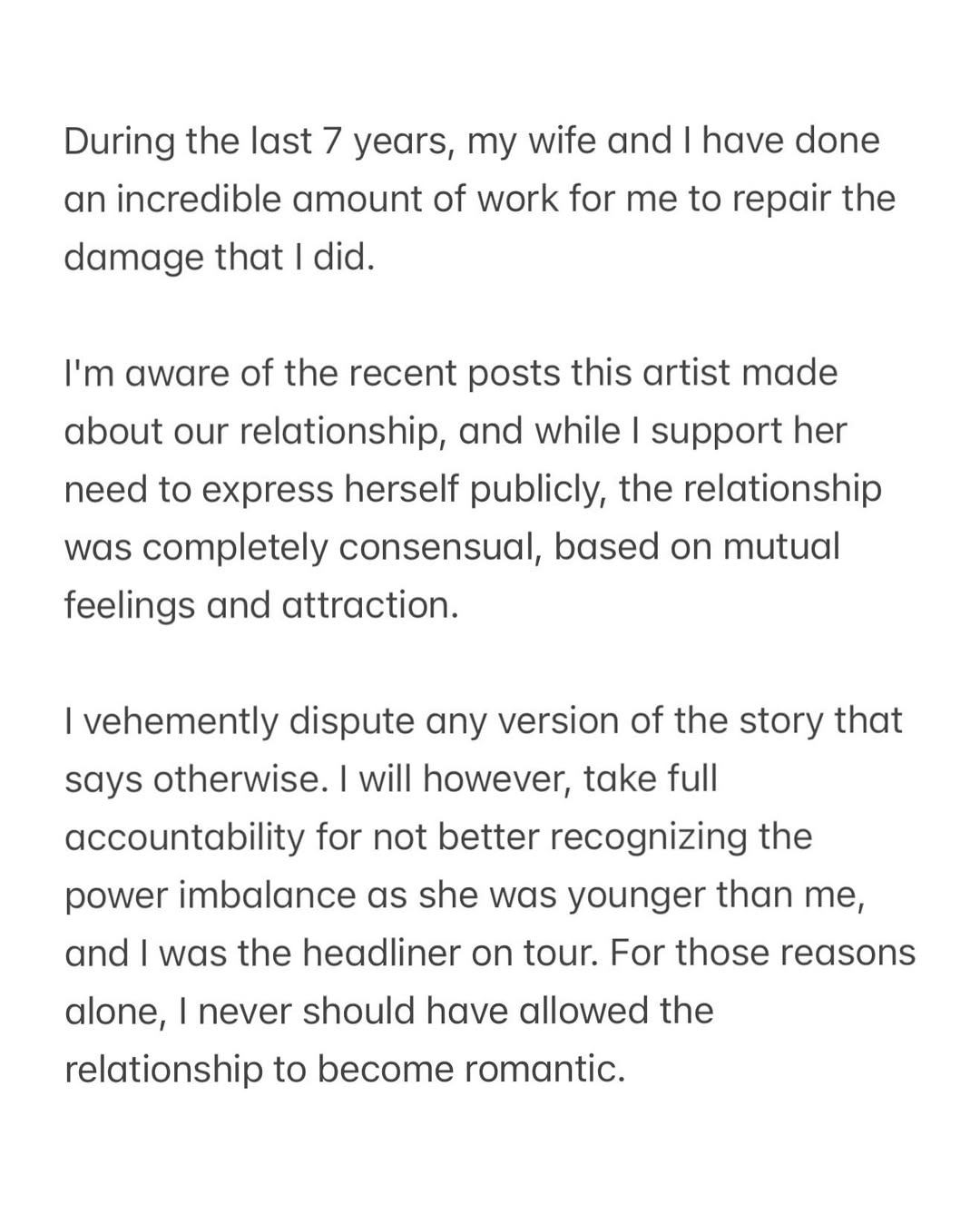 “I vehemently dispute any version of the story that says otherwise. I will, however, take full accountability for not better recognizing the power imbalance as she was younger than me, and I was the headliner on tour,” he added.