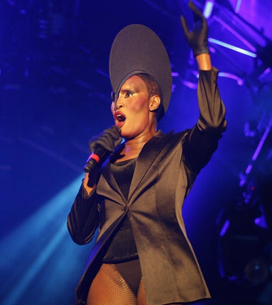 Eighties style icon and pugilist Grace Jones took Somerset House's outdoor stage back to the future with her vibrant parade of gravity-defying wardrobe selections, raunchy jokes and much-loved hits.