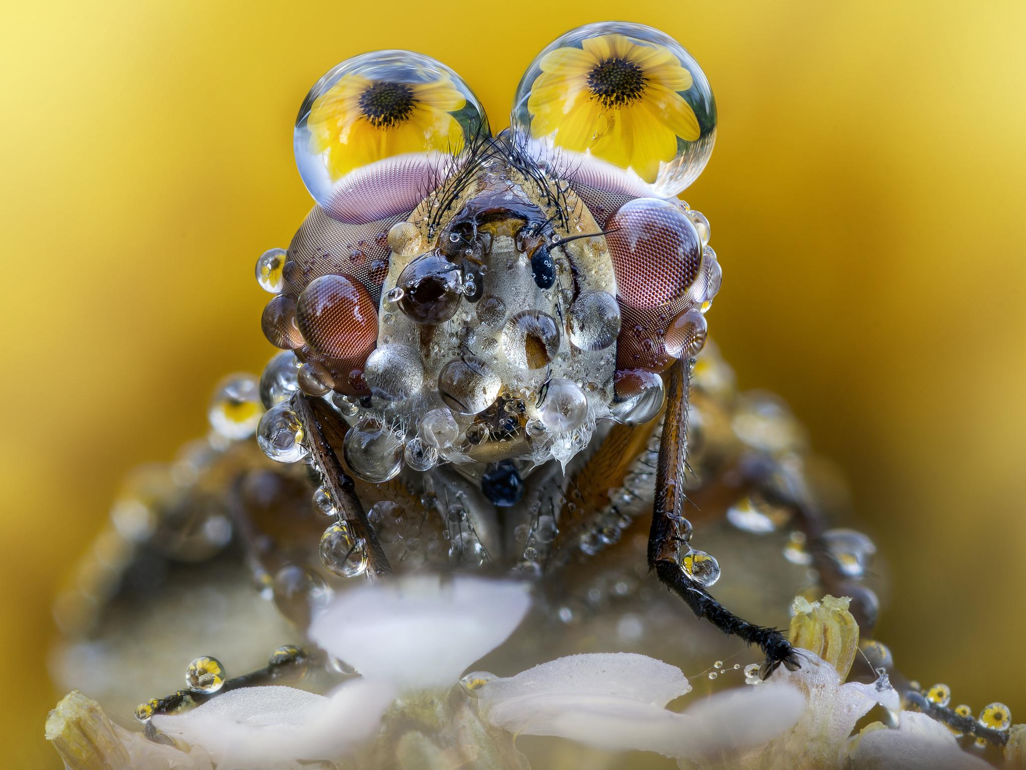 In the images, big rain droplets are scattered across the insects as they bathe in the morning light.