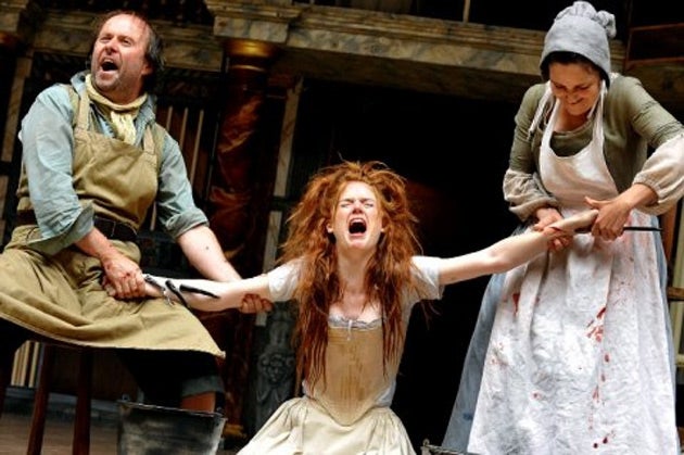 A case in point is the moment when a groundling (who looked to be a plant on press night) is dragged onstage and jokily threatened with a battery of the barbaric cures – leeches, laxatives, and bloodletting – that we have just seen inflicted on the patients at the asylum. It's pure genial pantomime and produces not a flicker of discomfort. Nor as spectators are we ever made to feel in a queasy kinship with the callous, voyeuristic visitors who cough up their penny to gawp at the inmates and poke at them with their sticks.