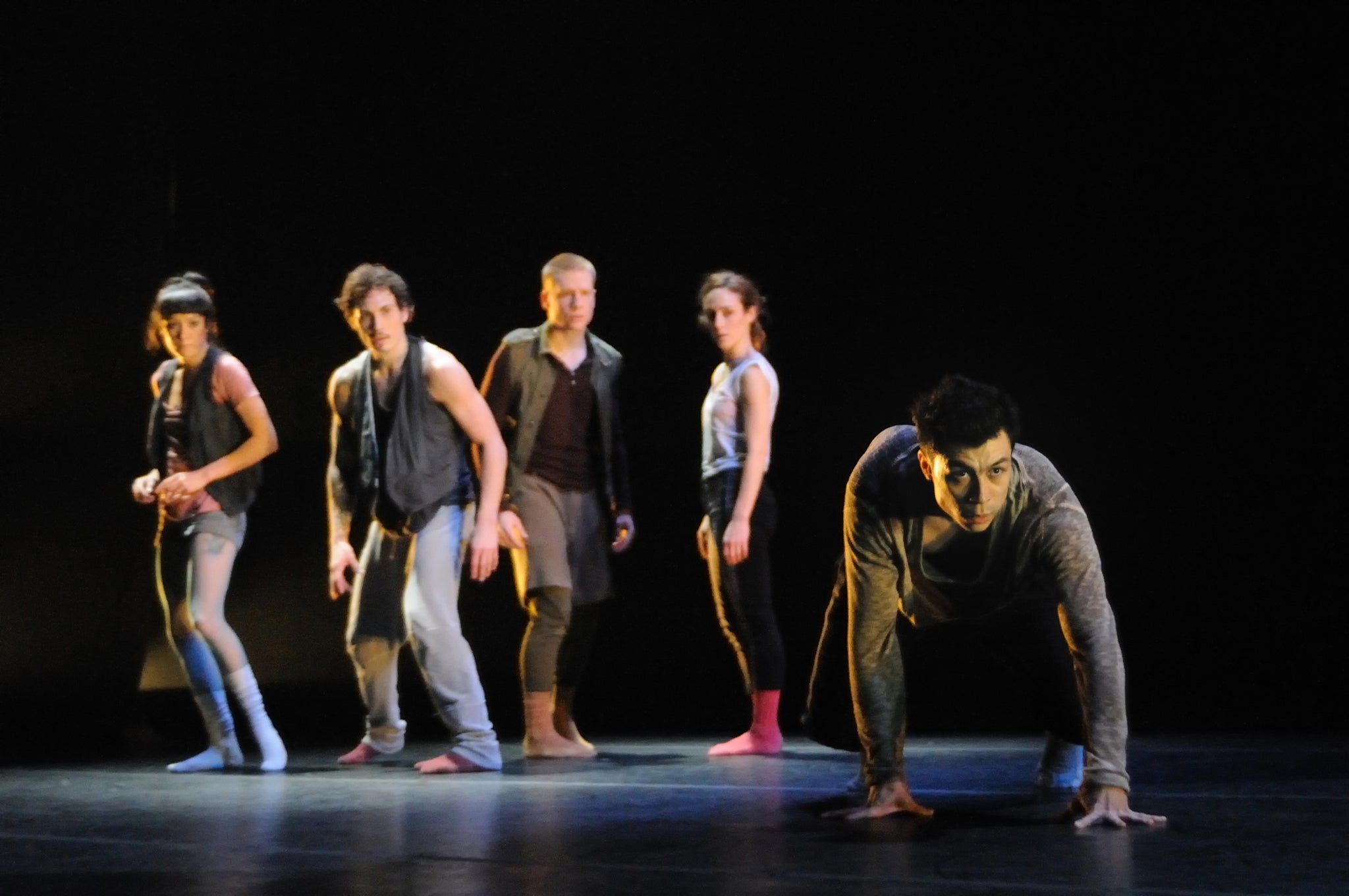 In Gravity of Center, RUBBERBANDance Group literally pushes its dancers to the brink. Early on, the five dancers scurry up to the front of the stage, where one of them lurches out, starting to fall. The others are only just in time to save him, grabbing hold of his arms or clutching at his clothes. The audience audibly catches its breath.