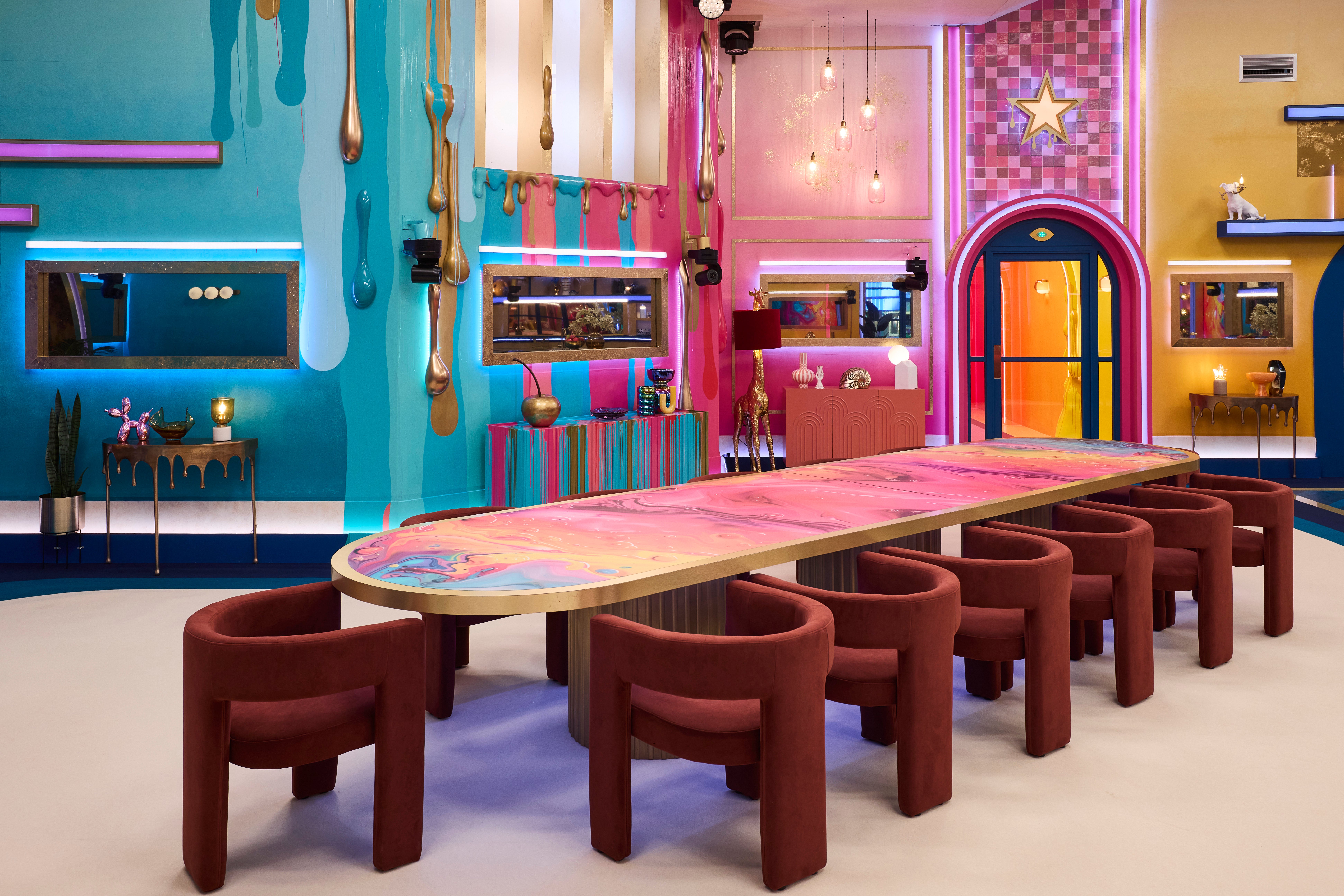 Before this year’s cohort of celebrities make their CBB debut this evening, here’s a sneaky look inside the new Big Brother house. As ever, it’s been decorated with all the extravagant zeal of an over-excited kid decorating on Sims 2. Minimalism? The CBB interior designers haven’t heard of it. 2025’s aesthetic seems to be all about dripping blobs of paint in pink and blue.