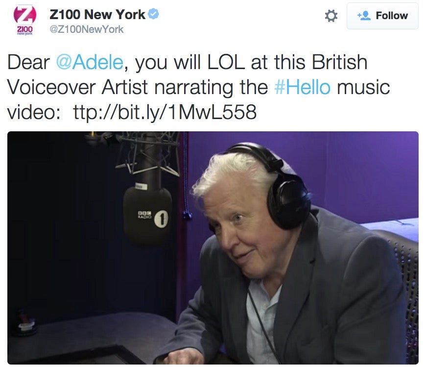 Hey Z100 New York, that man that “will make Adele LOL” with his narration of her music video is not “this British Voiceover Artist”, he’s David f*cking Attenborough.