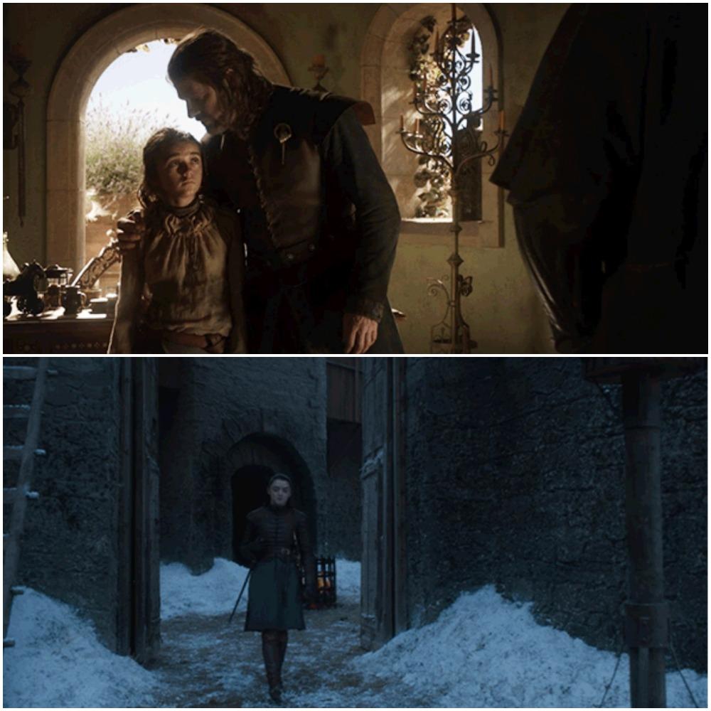 First off, there’s the way Arya is dressed; she wears armour almost exactly the same as Ned’s the last time they ever see each other.