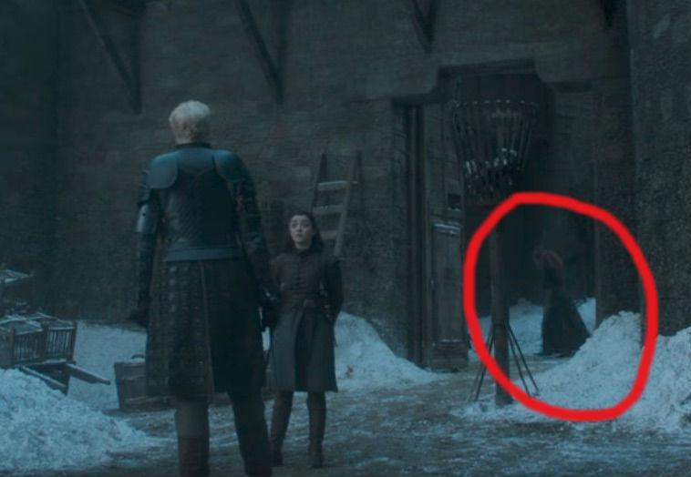 As Arya walks towards her protector, she tells Brienne, “You swore to serve both my mother's daughters,” and it's at this precise moment that fans believe the cloaked spectre of fallen Stark matriarch Catelyn (Michelle Fairley), who perished in season three's Red Wedding, can be seen walking past in the background.